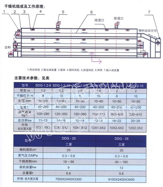 物料由加料器均勻地鋪在網(wǎng)帶上,網(wǎng)帶采用12-60目不銹鋼絲網(wǎng)。由傳動(dòng)裝置拖動(dòng)在干燥機(jī)內(nèi)移動(dòng)。干燥機(jī)由若干單元組成,每一單元熱風(fēng)獨(dú)立循環(huán),部分尾氣由專門排濕風(fēng)機(jī)排出,廢氣由調(diào)節(jié)閥控制,熱氣由下往上或由上往下穿過鋪在網(wǎng)帶上的物料,加熱干燥并帶走水分。網(wǎng)帶緩慢移動(dòng),運(yùn)行速度可根據(jù)物料溫度自由調(diào)節(jié),干燥后的成品連續(xù)落入收料器中。上下循環(huán)單元根據(jù)用戶需要可靈活配備,單元數(shù)量可根據(jù)需要選取。